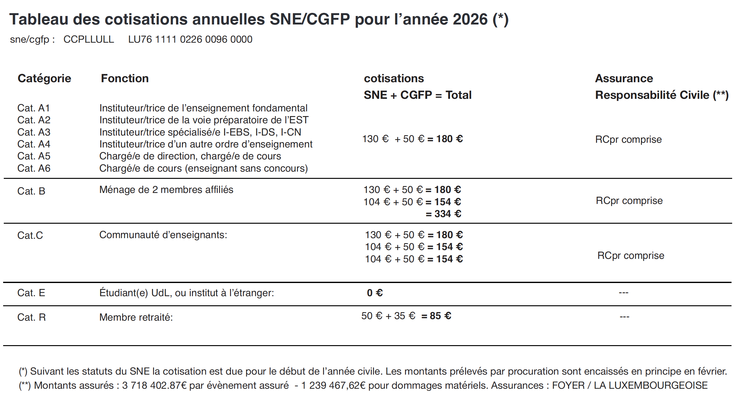 Tableau des cotisations pour l'année 2026